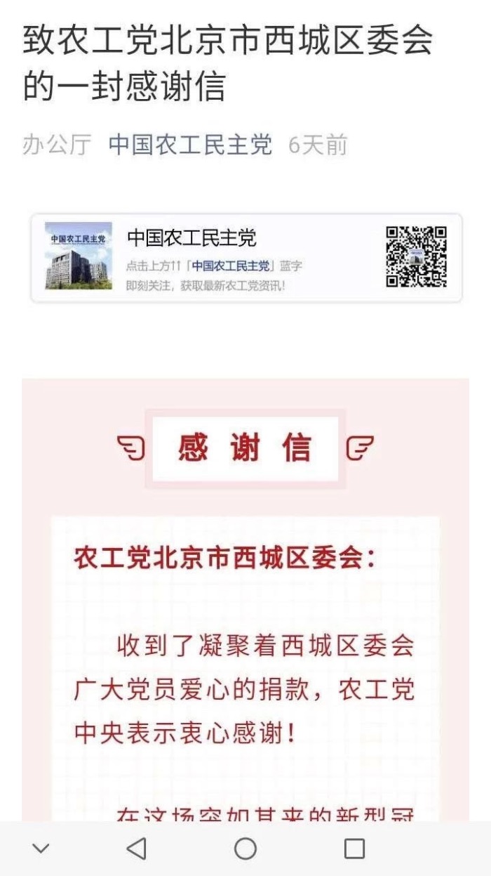 新冠肺炎疫情暴发以来,农工党北京市委各级组织和党员干部通过各种方式向抗疫一线提供援助支持,以实际行动抗击新冠疫情。截至2020年2月20日,据不完全统计,累计捐款达到471万元;累计捐物价值达到5893.6万元。在这其中,涌现了许多感人的事迹。