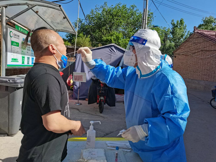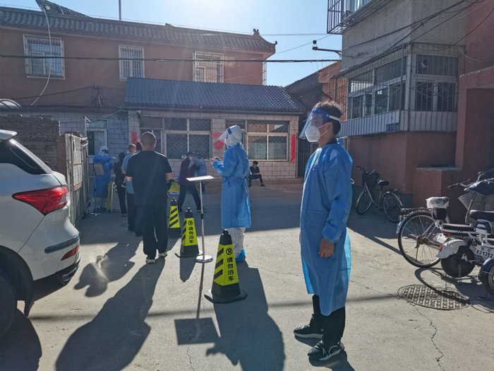 祁向东作为延庆区医院ICU主任与一位同事进行核酸采样,白华、吕毅夫、刘均平和黄俊平分为两组,分别在两个核酸检测点协助维护秩序,提示居民扫码测温,向居民宣传疫情防控相关政策要求,保证核酸检测活动的顺利开展,最大程度地保护群众的健康安全。