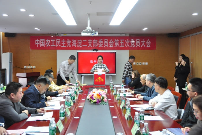 海淀二支部第四届委员会主委方明宇作工作报告。党员们通过现场投票的方式选举王琳、张宁、陈肇翔、郦威、韩笑冰等5名同志担任第五届委员会委员。随后召开新一届支部委员会第一次全体会议,选举陈肇翔为主任委员,张宁、韩笑冰为副主任委员。