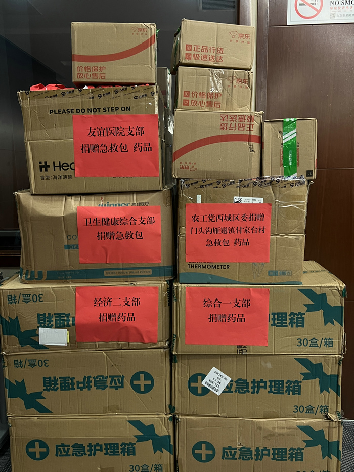 灾情发生后,西城区委第一时间与结对帮扶的门头沟区雁翅镇付家台村取得联系,了解受灾情况和物资急需。在了解到付家台村急需急救包、止泻药和皮炎药等物资情况后,区委动员各支部积极捐赠物资,短时间内共收集到综合一支部、经济二支部、卫生健康综合支部、友谊医院支部等支部捐赠的急救包246个,止泻药、皮炎药282盒,已统一送至付家台村村民手中。