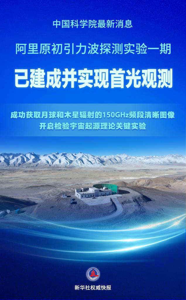 在海拔5250米的西藏阿里地区,由中国科学院高能物理研究所牵头,联合中国科学院国家天文台、美国斯坦福大学等国内外16家科研机构共同研制,历时8年建成的阿里原初引力波探测实验一期(AliCPT-1)实现首光观测,成功获取月球和木星辐射的150GHz频段清晰图像,并于7月13日正式发布。
