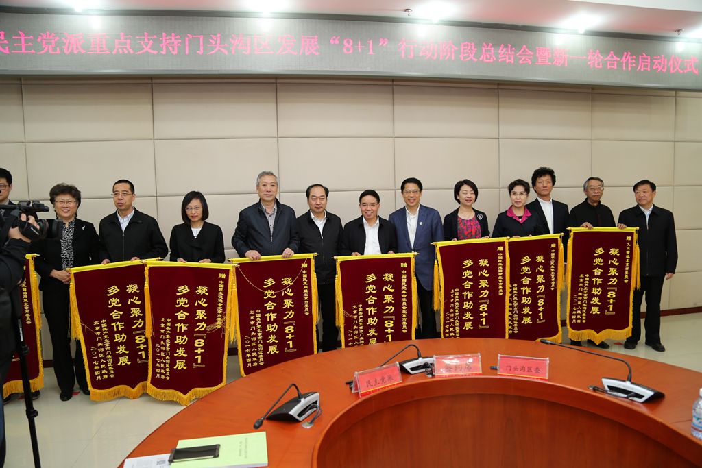 2013年12月4日,在中共北京市委统战部的直接关心和大力支持下,中共门头沟区委与各民主党派市委锐意创新,积极探索,共同启动了北京市各民主党派重点支持门头沟区发展“8+1”行动。8,是指民革、民盟、民建、民进、农工党、致公党、九三学社、台盟8个民主党派市委,1,是指门头沟区。“8+1”行动,就是汇聚八个民主党派优势资源,重点支持一个区域发展,是新形势下深化“凝心聚力”工程的重要举措,是统一战线服务区域经济社会发展的创新模式。
