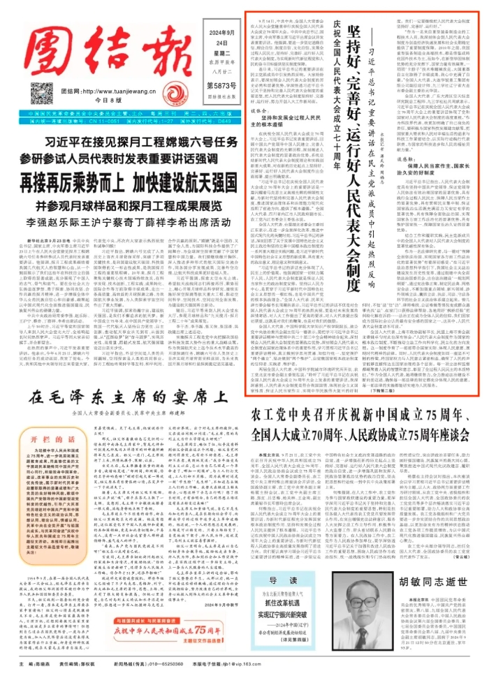 9月14日,中共中央、全国人大常委会在人民大会堂隆重举行庆祝全国人民代表大会成立70周年大会。中共中央总书记、国家主席、中央军委主席习近平出席会议并发表重要讲话。