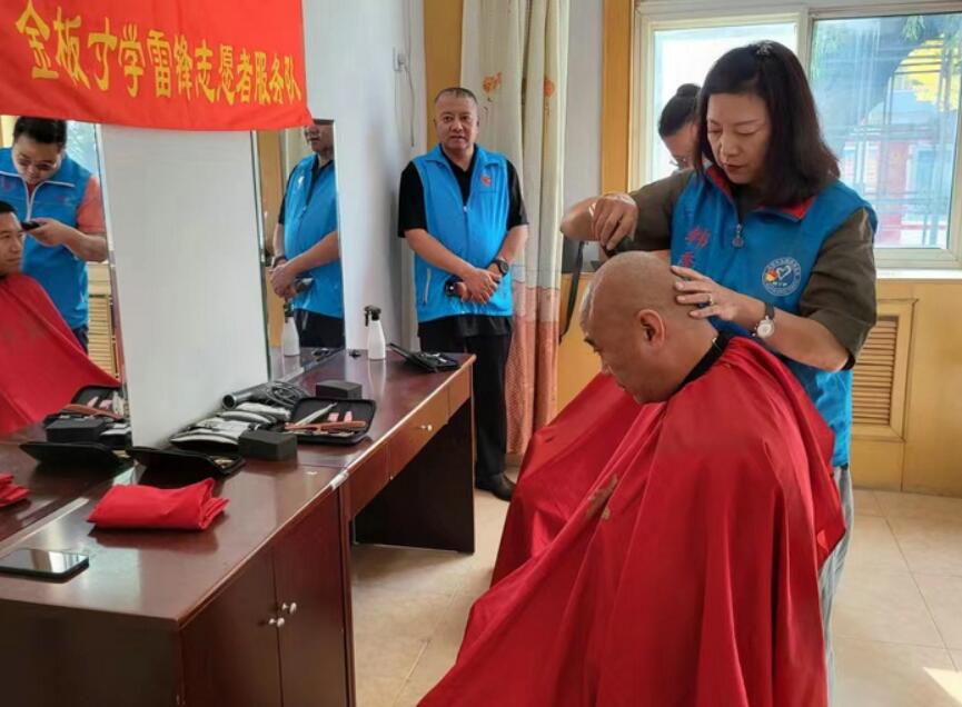 东二支部党员、北京金板寸文化发展中心负责人刘清池带领金板寸学雷锋志愿者服务队为民警义务理发。