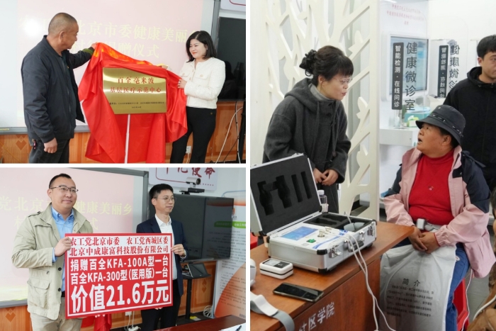 座谈会前举行了捐赠仪式。农工党党员企业、北京中成康富科技股份有限公司向青白口村捐赠了百全毫米波治疗仪,并设立“百全毫米波基层医疗示范中心”,村民现场进行了体验治疗。农工党党员医疗专家还为村民进行了义诊咨询。