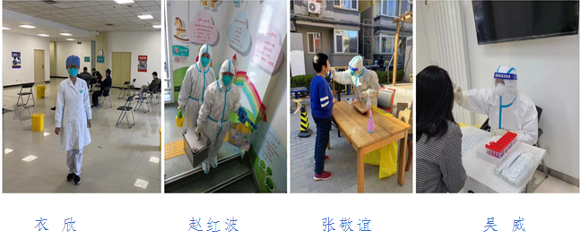 综合一支部党员赵红波、张敬谊,综合二支部党员衣欣、马欣、吴威支援西城区新街口街道、广外街道、牛街街道大规模核酸检测和疫苗保障工作。