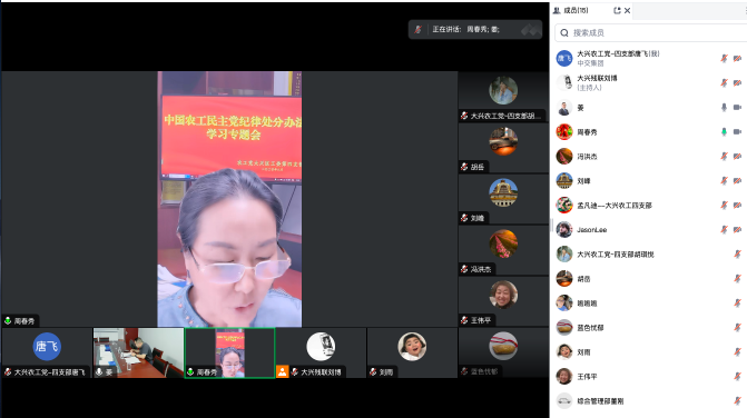 2024年8月22日,农工党大兴区工委四支部以线上、线下结合的形式召开纪律学习教育专题学习会。四支部主委周春秀、副主委姜英龙等共30余名党员参加。学习由周春秀主持。