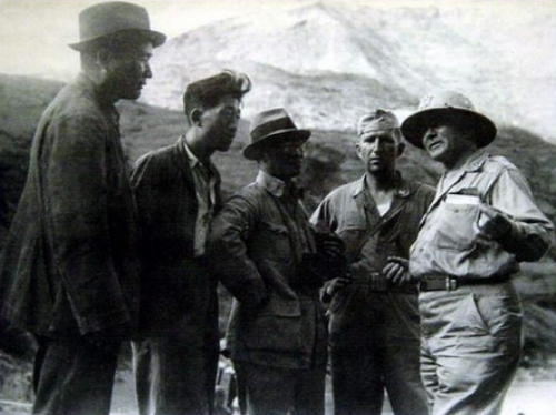 1944年,李温平(中)与美国将军薛德乐(右)在惠通桥头视察