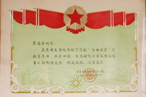 同时,美军总部奖给他一面锦旗,上面绣着中印公路路线及开通日期。1946年12月,美国总统发布命令,授予李温平等4名中方工程技术人员铜质“自由勋章”,这是美国政府向民间人士颁发的最高勋章。直到1984年7月,才由薛德乐将军亲自将此勋章佩戴在李温平的胸前。